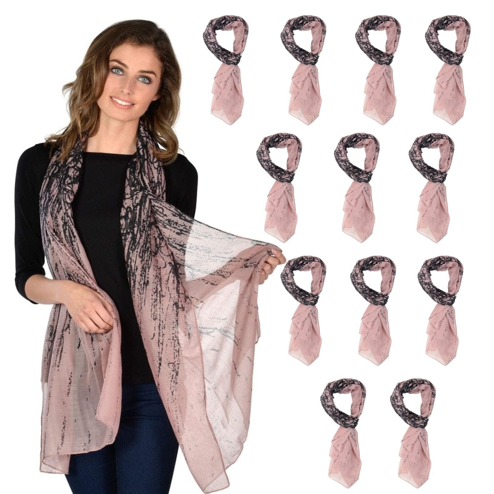 *This listing is for 12 x Women’s Pink Black Abstract Print Sheer Scarf*