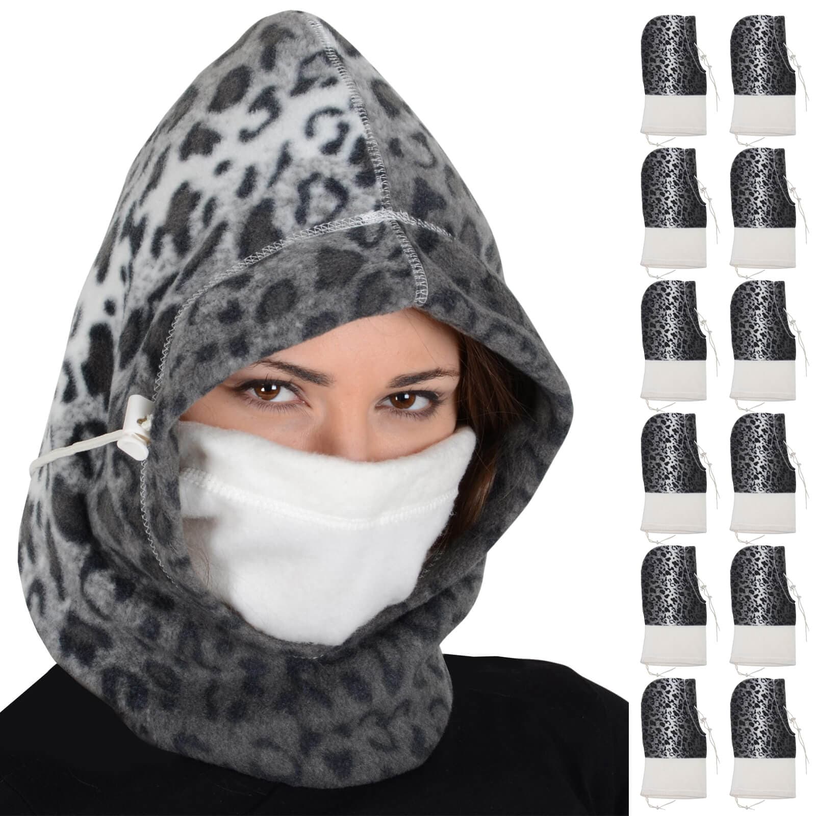 It is described as a reversible polar fleece hood designed as a 6-way defence against bitter winter cold, featuring a grey and white snow leopard print.