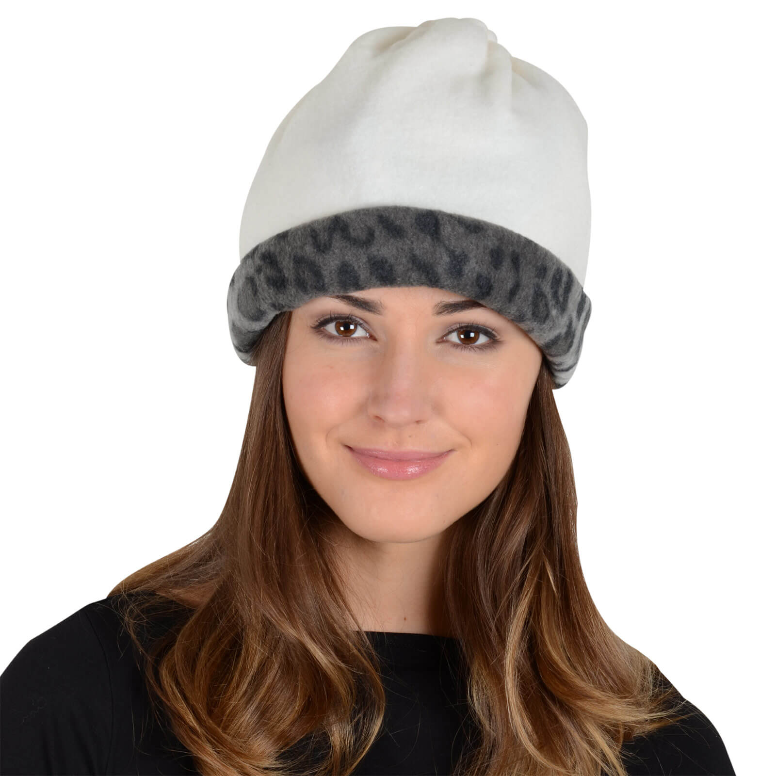 This amazing, reversible, fleecy polar hood is a 6-way defence against the bitter winter cold and the snow leopard print looks fabulous too. It's so much more than a hood! Wear it as a balaclava, face mask, neck warmer, hood or beanie hat. You can even use it as a bag!