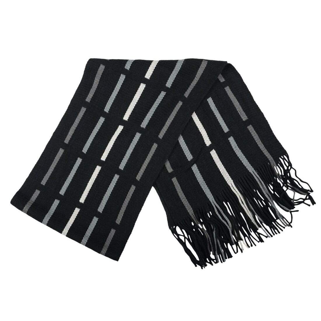 The scarf features a classic black knit with a white and grey tone patterned stripe design, finished with traditional fringed edging.