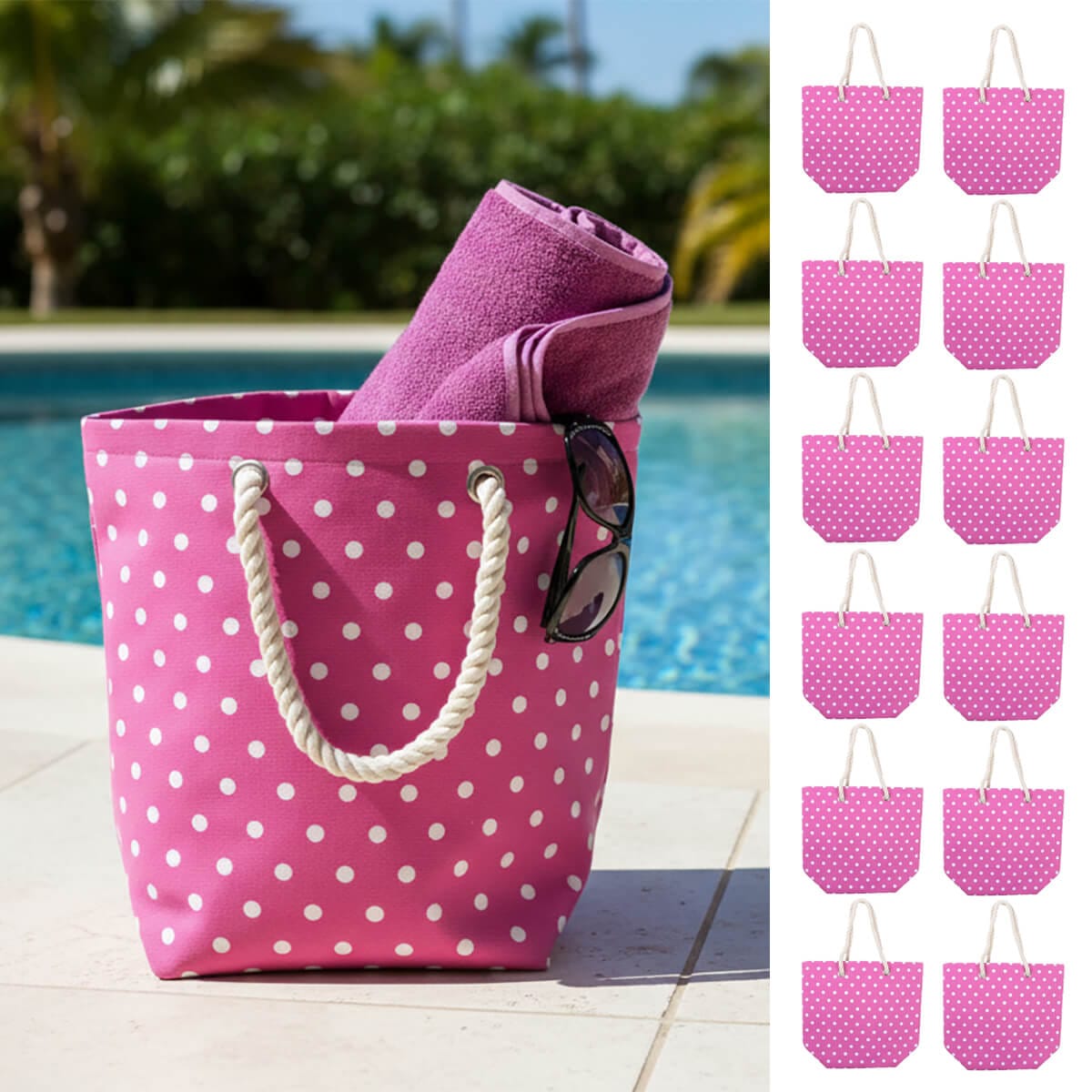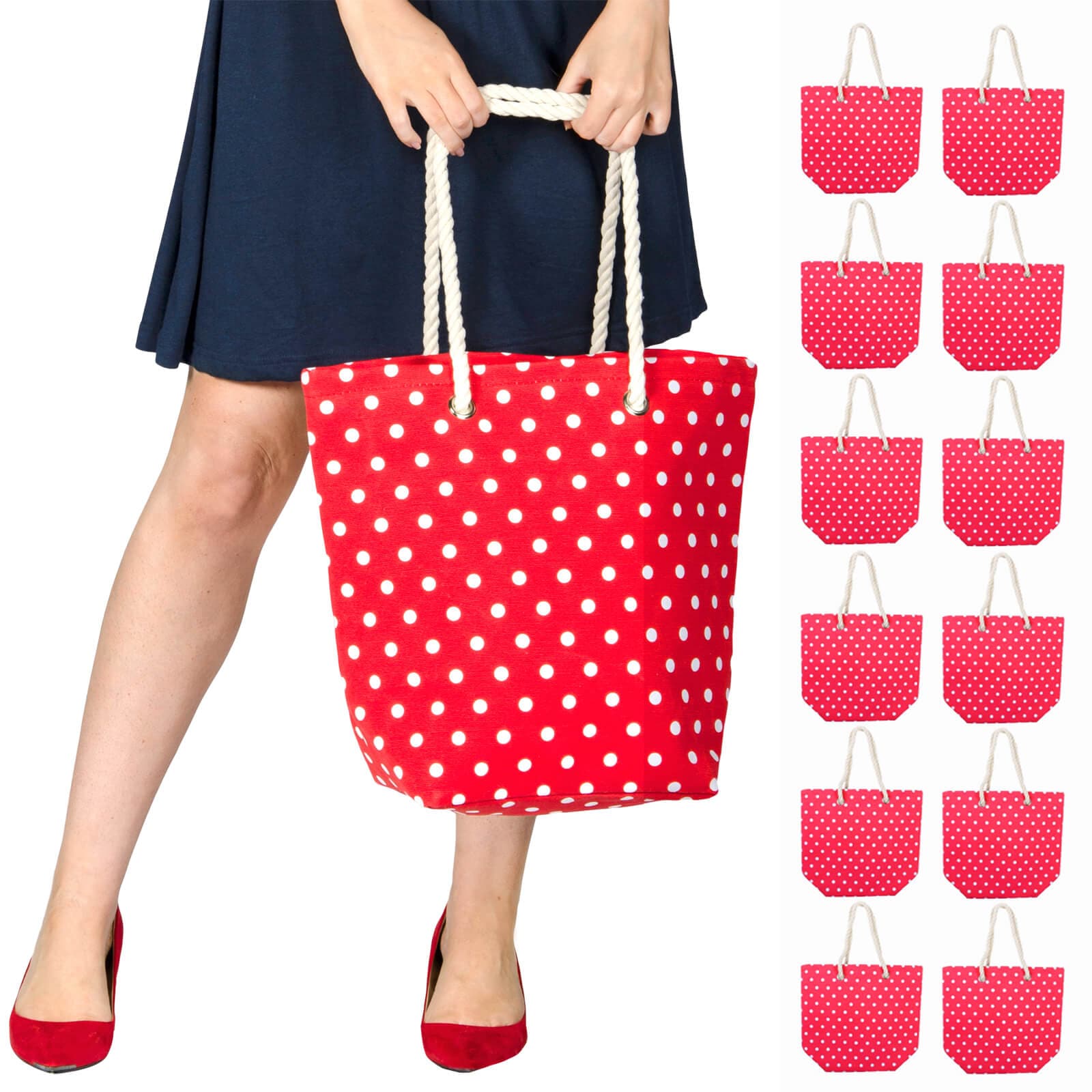 This listing is for a bulk pack of 12 × Polka Dot Canvas Beach Bags (Slight Seconds).