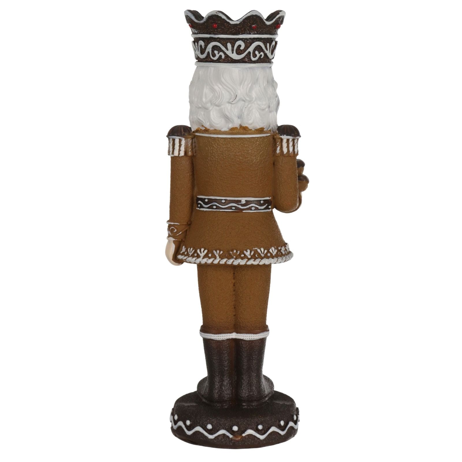 back view of gingerbread style nutcracker wearing crown with icing and cherry details