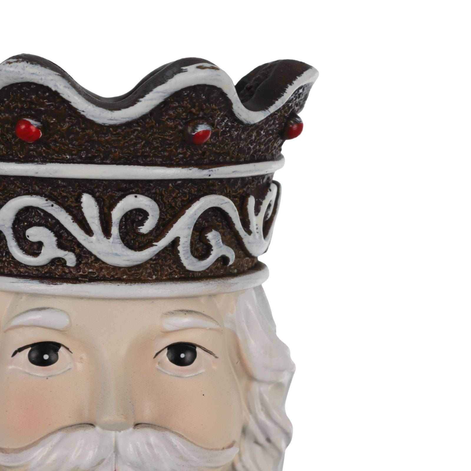 Close-up of a decorative nutcracker head with a crown and beard on a white background