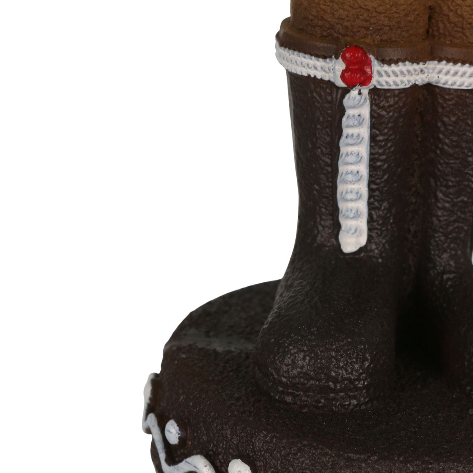 detail shot of gingerbread nutcracker figure boots on icing chocolate style platform with white swirl detail