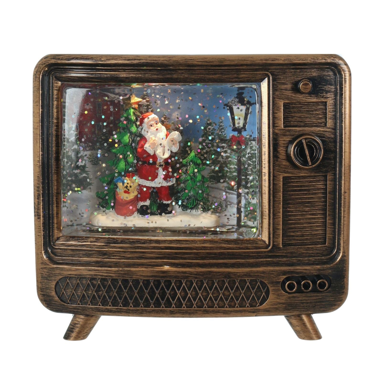 Bring festive nostalgia into your home with the Mr Crimbo Christmas Glitter LED Water Spinner Antique TV Ornament. Designed in the style of a retro television set with an antique gold finish, this unique decoration showcases a heartwarming Christmas scene inside the “screen.” Featuring Santa Claus with his sack of gifts, Christmas trees, and a snowy street lit by a glowing lamppost, the scene comes to life with swirling glitter that sparkles like falling snow. A built-in warm white LED light adds a cosy glow, while the continuous water spinner ensures the glitter moves without needing to shake - a modern twist on the traditional snow globe. Perfect for styling on mantels, sideboards, hallway tables or as a festive centrepiece, this timeless decoration is one you’ll treasure year after year.