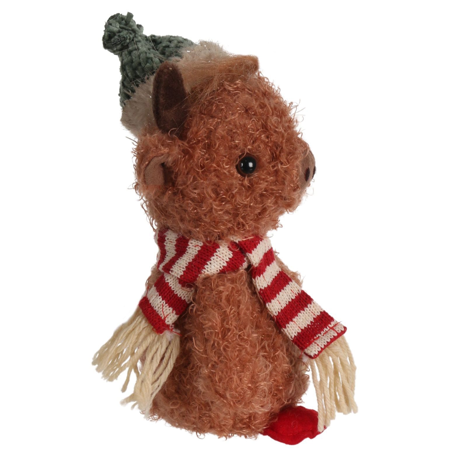 This Sitting Highland Cow Christmas figure from the Mr Crimbo range will add a touch of Scottish Highlands charm to your home over the festive season. The adorable, on trend, plush sitting Highland Cow decoration is made from soft fabrics and knits in festive red, white and green. The 21cm tall Christmas Highland Cow figure wears a green hat with white trim and a red and white striped knitted scarf. Cute and beautifully crafted for you to display on a mantlepiece, windowsill or shelf.