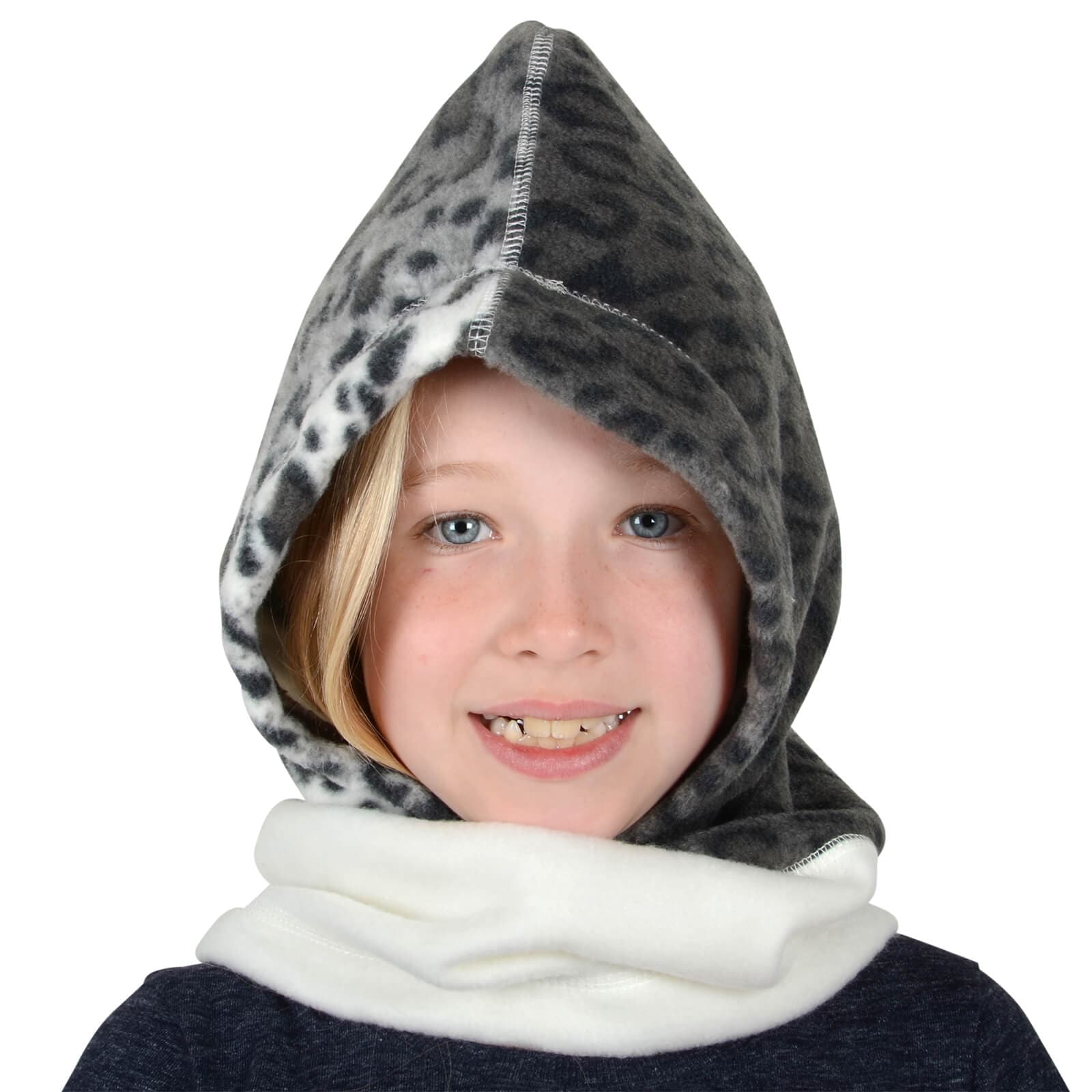 Help your little one battle the cold with this cosy snow leopard print polar fleece hood for children. It's so much more than just a normal hood! Wear it as a balaclava or as a neck warmer. The gorgeous grey and white animal print soft fleece hood is cosy and comfortable for kids to wear while playing outdoor sports, or on their walk home from school. And it looks fabulous too! One size fits most children over 5 years