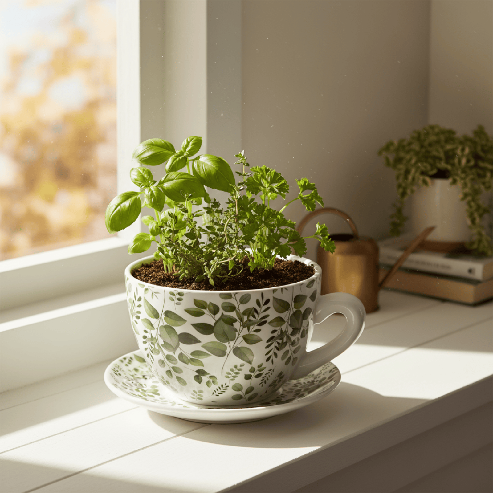 Herb plant in a decorative teacup on a windowsill