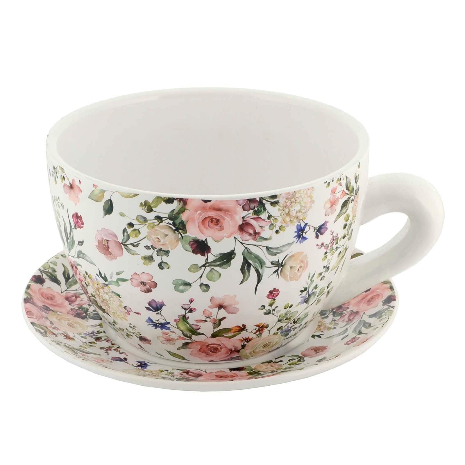Teacup shape planter with saucer  and printed with rose and floral pattern