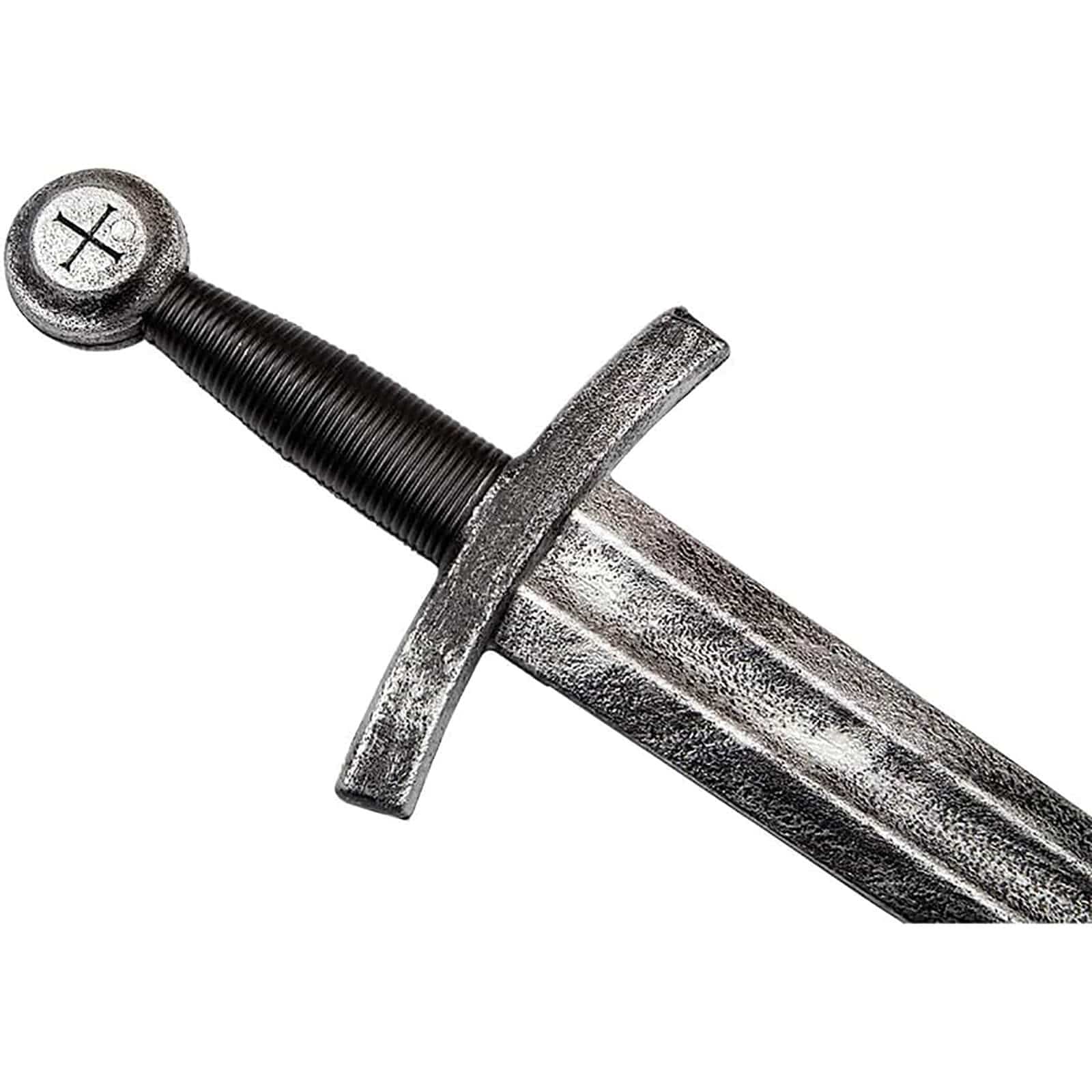 Add the final touch to your medieval knight, Knights Templar, crusader and lots more fancy dress costumes with this large medieval sword. The realistic looking sword has an antique silver blade and hilt, with black handle decorated with a cross symbol. Medieval sword length: 70cm (27.5").