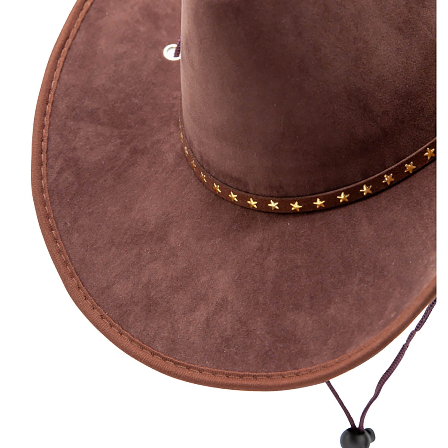Close up of brown suede cowboy hat with star-studded band on a white background