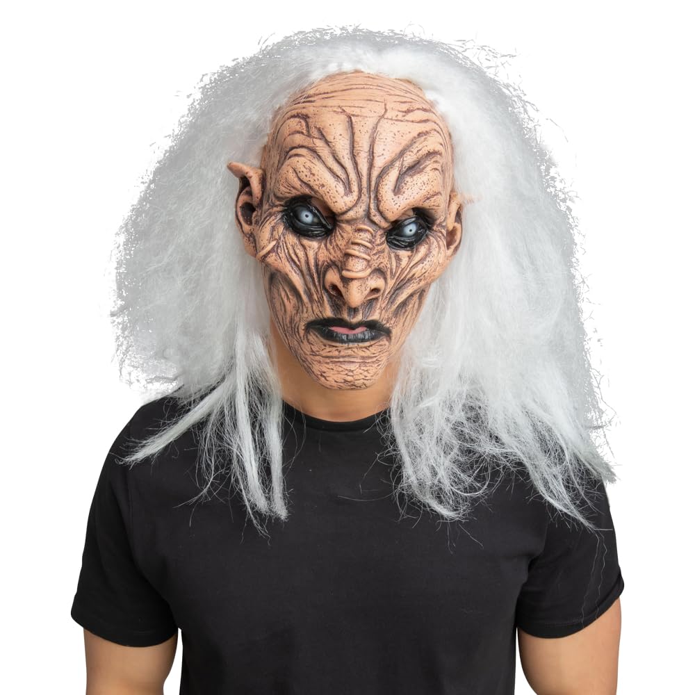 The White Haired Demon latex full head mask is ideal for Halloween and fancy dress parties, horror movie nights, stage and theatre drama productions and lots more. This is not a toy. For use by adults only.