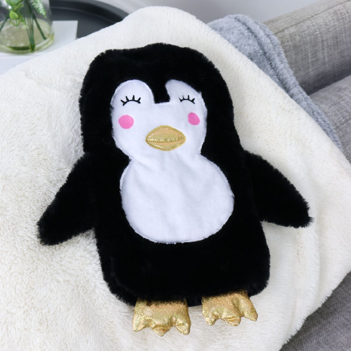 The cute penguin character hot water bottle will help keep you warm with a touch of glam! The cover features black and white fleece fabric with sparkling gold metallic fabric beak and feet. The perfect gift for a birthday or Christmas, or treat yourself today!