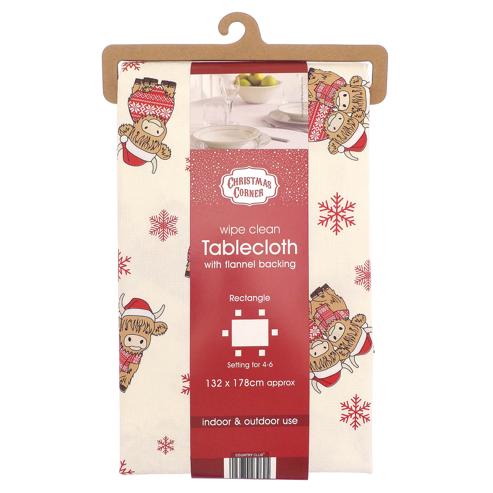 Treat your dining table to a Christmas makeover with this Wipe Clean Tablecloth from Country Club. The festive tablecloth will protect your table from spills and scratches and it looks great too. This Christmas tablecloth has an easy to clean PEVA surface with a flannel backing to prevent it sticking to your table. Available in a choice of red berry or Highland Cow designs, this 132 x 178cm rectangle tablecloth can be used indoors or out in the garden if you're planning a Christmas barbecue!