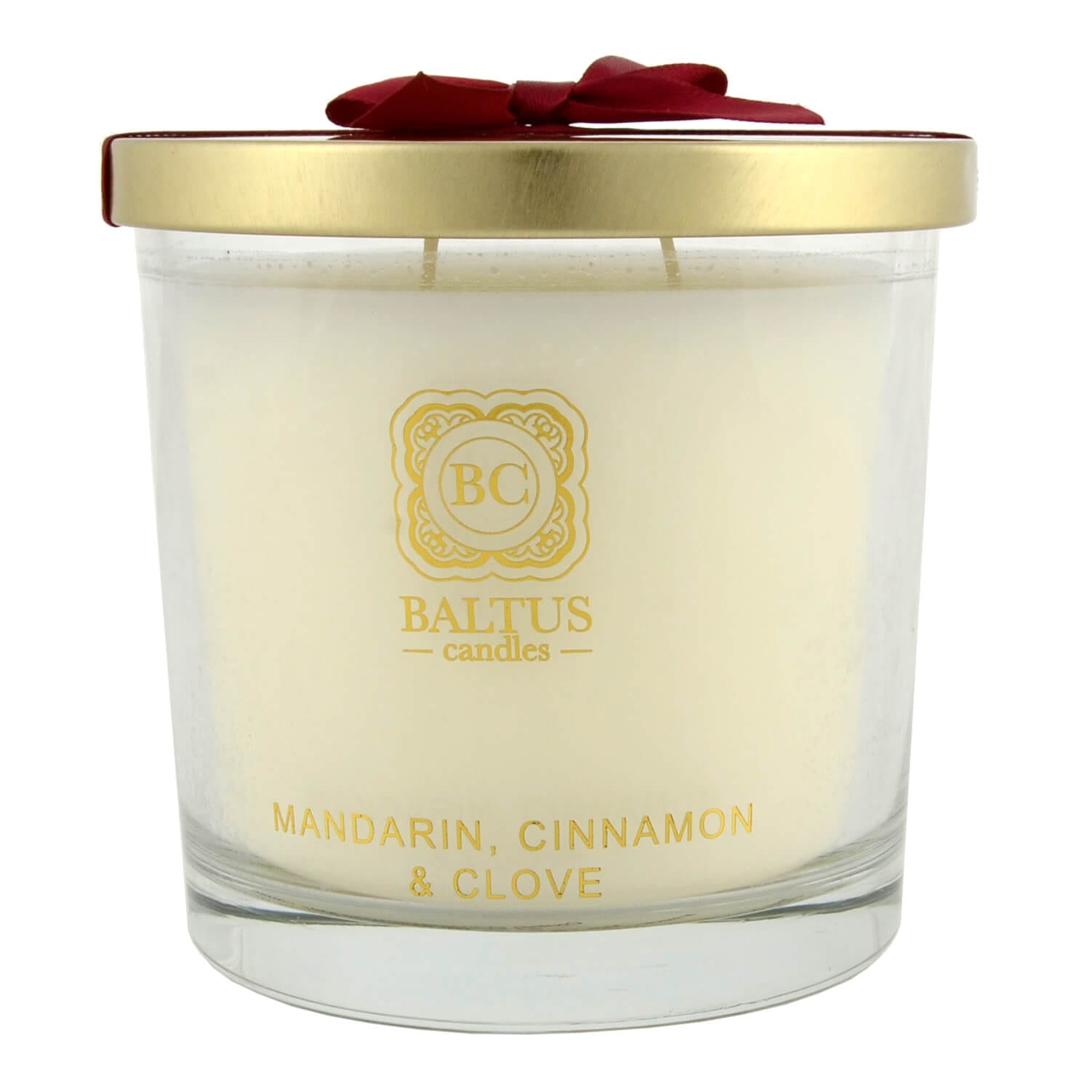 Give any room an elegant seasonal touch with this Christmas scented candle from Baltus. Infuse your home with the scent of mandarin, cinnamon and clove from this stylish Christmas candle. The spicy scented candle has a glass holder with gold branding, gold finish lid and dark red ribbon bow decoration. The double wick spiced scented candle will provide an even burn time of up to 30 hours and is a fabulous gift for Christmas.