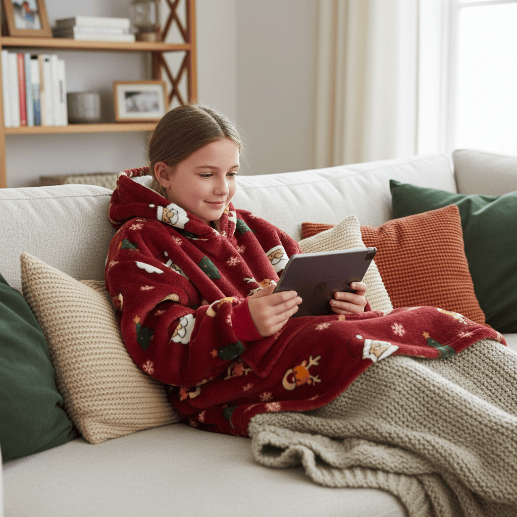 Kids will love cuddling up over the festive season in this Christmas Hoodie Blanket! The festive fleece hooded top has an all over pattern of Christmas icons in a choice of designs. This novelty seasonal design hoodie blanket is lined with thick white fleece to keep your child warm and cosy. This super soft blanket top has a large hood and a big pocket at the front to keep their hands warm too. This fun Christmas hoodie blanket is perfect for cosy evening on the couch watching Christmas films or relaxing on the sofa after school. Available in a choice of colours. One size fits most - see measurements below.