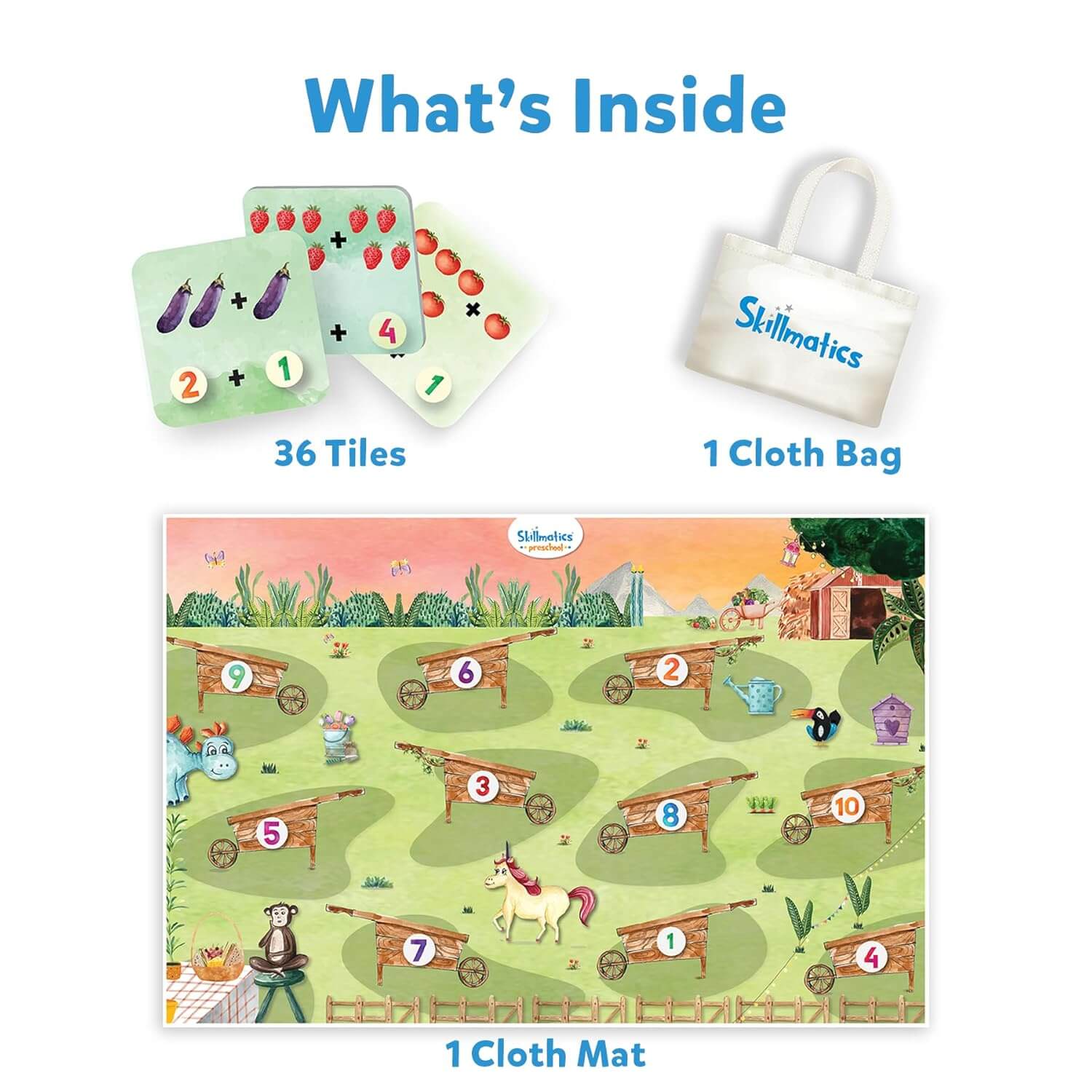 Encourage your preschool child to learn about shapes or numbers and counting with this Skillmatics Cloth Play Mat. Little ones can match the shapes or number tiles in the cloth bag to the ones on the mat and learn as they play. Each game has 36 tiles and is available in a choice of Counting Carts with fruit and vegetable tiles to match and learn to add, or Garden of Shapes with object tiles to match and identify. A fun game to develop gross motor, problem solving and critical thinking skills. A game for 1 or more players age 3+ years.